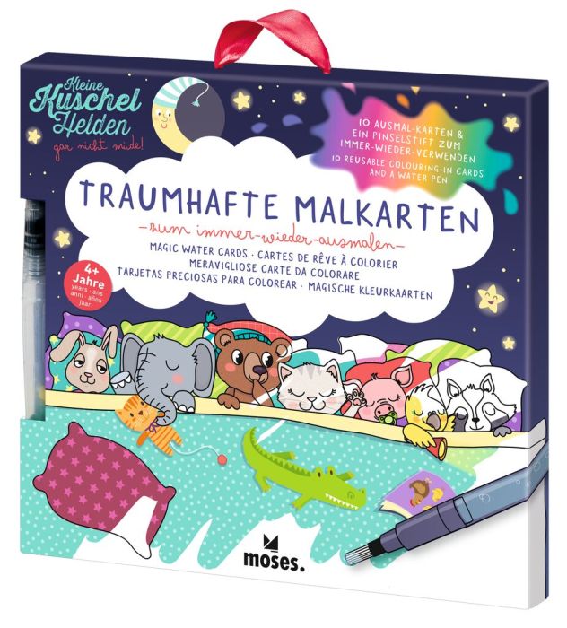 Wovon träumt der Elefant? Welches Abenteuer erlebt das kleine Schweinchen im Schlaf? Und wo wäre die kleine Katze gerne? Durch das Bemalen der traumhaften Malkarten können Kinder den kleinen Kuschelhelden ins Land der Träume folgen. Durch die ruhige Beschäftigung werden auch die Kleinen selbst langsam müde und erleben schon bald im Schlaf ihre eigenen Traum-Abenteuer. Die wunderschönen Illustrationen der niedlichen Tiere lassen Kinder fabelhafte Traumwelten entdecken und wecken die Vorfreude auf das eigene Ins-Bett-Krabbeln.. Die zehn unterschiedlichen Ausmal-Karten können mit dem beigelegten Pinselstift wie von Zauberhand ausgemalt werden. Nach dem Trocknen verschwinden die Farben wieder, sodass die magischen Karten beliebig oft ausgemalt werden können. Da der Stift lediglich mit Wasser befüllt werden muss, ist das Malkarten-Set perfekt für unterwegs und sorgt auch im Urlaub für eine entspannte Gute-Nacht-Routine. Ein Muss für das abendliche Zur-Ruhe-Kommen!