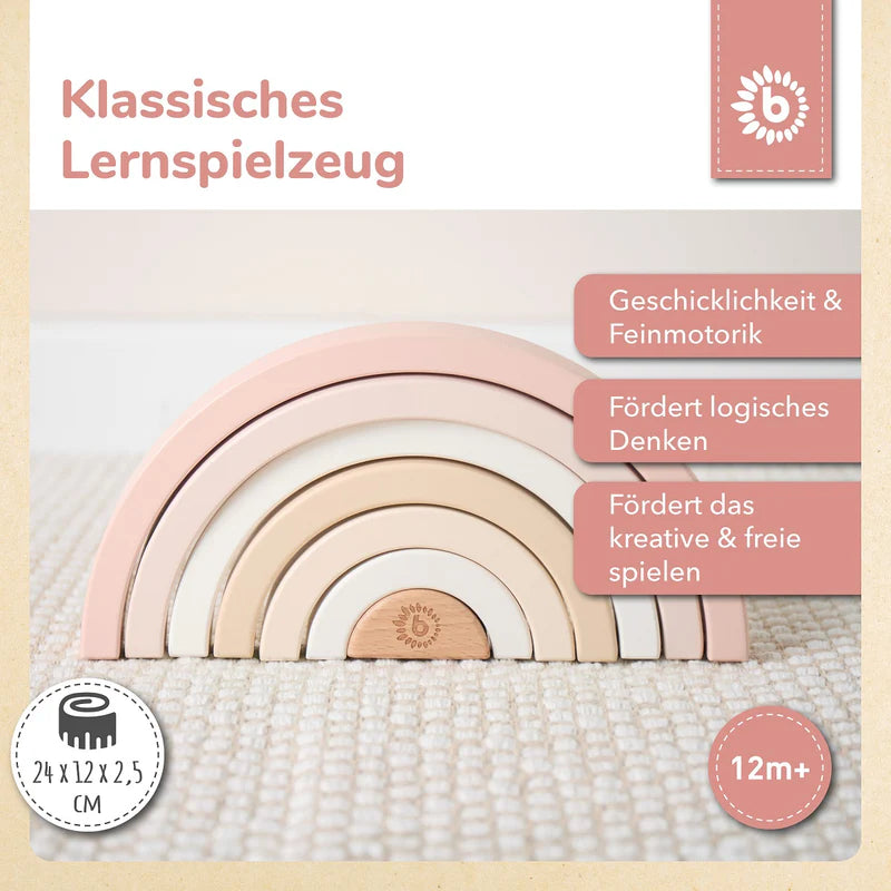 Der liebevoll gestaltete Holz-Regenbogen in sanften Rosé- und Naturtönen unterstützt spielerisch die motorische Entwicklung sowie das Farb- und Formenverständnis deines Kindes. Die sieben robusten Holzbögen lassen sich vielseitig verwenden – ob gestapelt, sortiert oder fantasievoll kombiniert – der Kreativität sind keine Grenzen gesetzt.