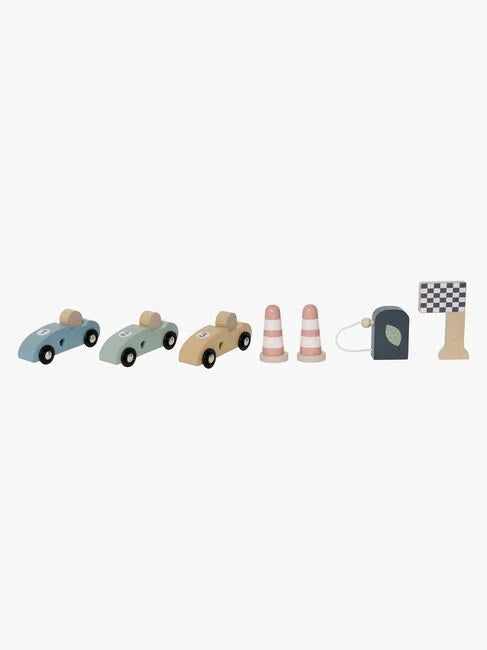 - Enthält: 1 Autorennbahn mit einer coolen Rampe, 3 Rennautos, 1 Flagge, 2 Kegel, 1 Zapfsäule.