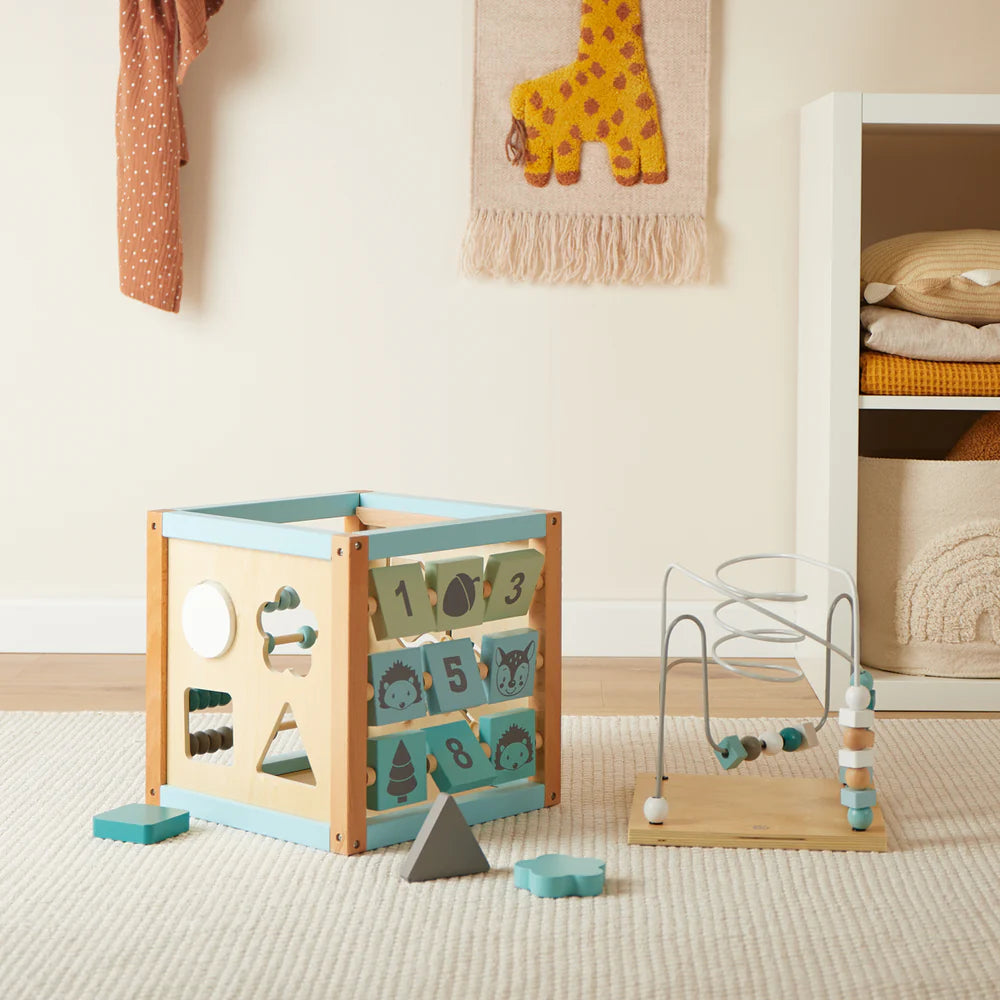 An einer Seite des Würfels befindet sich ein Steckspiel mit vier verschiedenen geometrischen Formen, das Deinem Kind dabei hilft, Formen zu erkennen und seine Hand-Auge-Koordination zu verbessern. Die beweglichen Holzperlen laden zum Verschieben ein und fördern erste Erfahrungen im Sortieren und Zählen.