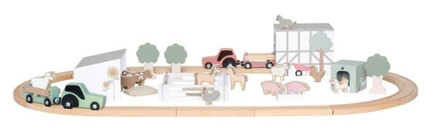 Komm mit auf den Bauernhof! Rund um das Holzschienenbahnset spielt sich das bunte Leben auf dem Bauernhof mit seinen vielen Tieren ab. Baue die Schienen zusammen und platziere den Unterstand, die Hundehütte und das Bauernhaus entlang der Schienen. Die Tiere grasen auf der Koppel im Schatten der Bäume. Bring den Kühen Heu und gib den Pferden leckere Karotten und Äpfel. Kennst du die Namen aller Bauernhoftiere? Auf den Schienen fahren die beiden Traktoren mit den Anhängern und versorgen die Tiere. Das Spielset regt zum kreativen Spielen an und sorgt für viele Stunden Spielspaß. Die Schienen sind auch mit denen anderer gängiger Marken kombinierbar. Das Set enthält