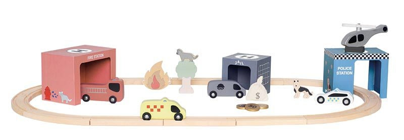 Mach dich bereit zum Feuerlöschen! Bei diesem klassischen Spielbahnset aus Holz gibt es eine Polizeistation, eine Feuerwache und ein Gefängnis. Baue die Schienen zusammen und platziere die Häuser entlang der Strecke, durch die Polizeistation können die Autos hindurch fahren. Das Polizeiauto und der Hubschrauber suchen die Diebe, die Geld gestohlen haben. Wenn sie gefangen wurden, bringst du sie ins Gefängnis. Der Helikopter kann jetzt nach dem Einsatz wieder sicher auf einem der 3 Häuser landen. Oh jeh, jetzt ist eine Katze in den Baum geklettert und kann nicht mehr herunter. Hol schnell den Feuerwehrwagen und hilf die Katze vom Baum runterzubringen. Und nun ist auch noch ein Feuer ausgebrochen, das du mit dem Feuerwehrwagen löschen kannst. Langsam kehrt wieder Ruhe ein und die Wagen können wieder in den Straßen patroullieren und auf neue Abenteuer warten. Das Spielset regt zum kreativen Spielen an und sorgt für viele Stunden Spielspaß. Die Schienen sind auch mit denen anderer gängiger Marken kombinierbar. Das Set enthält