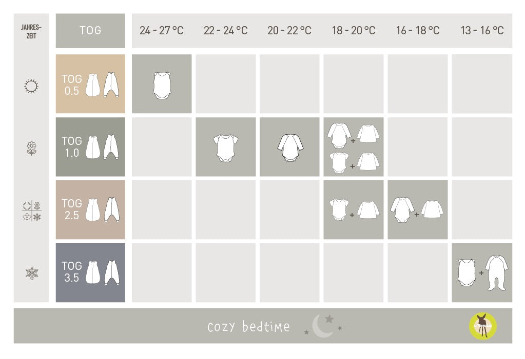 Der TOG-Wert ist eine Maßeinheit, die den Wärmewiderstand von Textilien darstellt: Je höher diese Maßeinheit, desto wärmer hält ein Produkt dein Kind. Der richtige TOG-Wert hängt von der Raumtemperatur ab, bei welcher dein Kind schläft. Je nach Raumtemperatur wird unterschiedliche Schlafbekleidung empfohlen, um eine angenehme Schlaftemperatur zu gewährleisten. In unserer TOG-Übersicht findest du detaillierte Informationen und Empfehlungen, um den individuellen Bedarf für jede Jahreszeit abzustimmen.