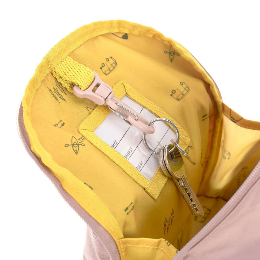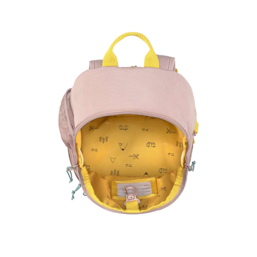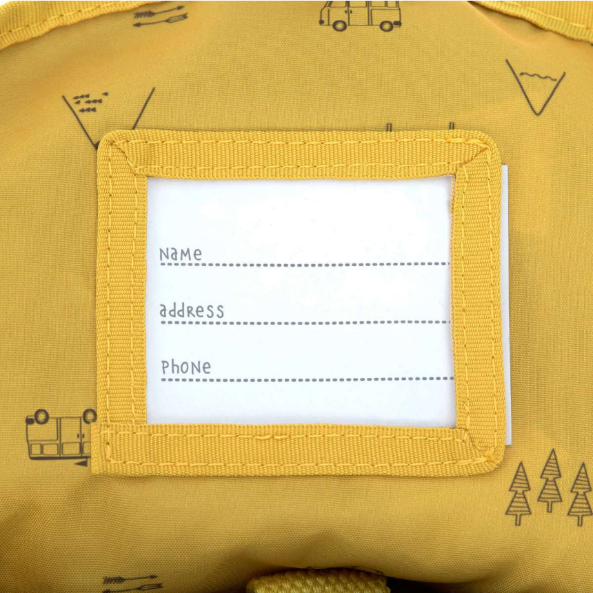 Das trendige Adventure Design in den Varianten Tipi in Altrosa oder Bus in Blau ist mit warmen Erdtönen und gelben Farbakzenten an Gurten und Griffen kombiniert.